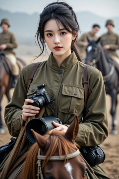 Full body photo, resolute, war correspondent, looking straight on, resolute eyes, dark lip color, practical makeup, (face close-up), olive skin tone, (wearing a military green jacket, holding a camera), brave, neat short hair, dynamic Perspective, horse galloping. The mount is a war horse that has experienced war, with firm eyes, messy mane, and firm steps. It travels on the battlefield with its owner and witnesses historical moments.
