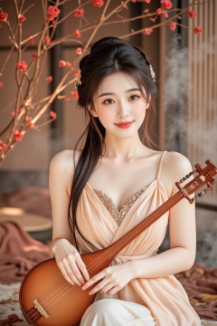 A girl with a smile on her face, gently playing with the pipa strings with her fingers, her long hair tied into a loose bun, wearing a light dance dress, dancing to the music, her complexion is as attractive as a peach, her style is soft and moving, The colors are warm and layered, like a melodious melody.