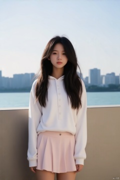 a young Asian woman stands . She is wearing a white long-sleeved button-down hoodie, a light pink skirt. Her hair is long and cascades down to her right, adding a touch of movement to her face. The backdrop, a backdrop of a cityscape can be seen, with a body of water and buildings in the distance. The sky is a pale blue, and the shadow of the woman is cast on the wall behind her.