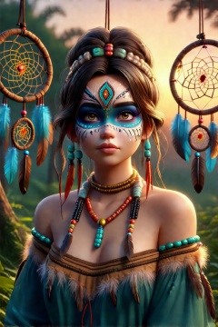 3d render of A serene woman with intricate face paint, feathers, and beaded accessories, surrounded by dreamcatchers against a twilight background