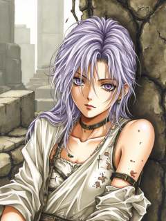 Kiri, a soft-colored illustration of a girl amidst the ruins, a testament to resilience amidst chaos. Her lavender hair, once a vibrant cascade, now hangs in tangled strands, interwoven with dust and shadows, framing a face etched with exhaustion and defiance. Her left eye, hidden in shadow, speaks of battles fought and scars borne, while her right eye, a striking violet, burns with an unwavering fire, a beacon of fierce determination in the face of overwhelming odds. She wears a simple chiton, its once-pristine white now a canvas of muted grays and browns, stained with the grime of a world torn asunder. Tears in the fabric reveal glimpses of bruises and scrapes, each mark a testament to her struggle for survival. Despite the ravages of conflict, the chiton clings to her slender frame, a fragile shield against the unforgiving world. She leans heavily against a crumbling stone wall, its rough surface a counterpoint to her delicate form. The weight of exhaustion is evident in the slump of her shoulders, the slight tremor in her muddied hands, yet her spirit remains unbroken. Her posture, a captivating blend of exhaustion and defiance, speaks of battles fought and a spirit unwilling to yield. She is a survivor, her gaze fixed on a future she will fight to reclaim.