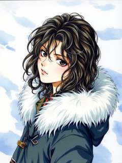 Kiri, a soft-colored illustration of a girl standing in a snowy landscape. Her shoulder-length curly black hair frames a face that holds the cool tranquility of the winter scene surrounding her. Her dark eyes, full of unspoken thoughts, gaze steadily towards something beyond the viewer, creating a sense of intrigue. She wears a hooded jacket, its soft, dark fabric contrasting beautifully with the pristine white fur trim that encircles her face. The hood is pulled up, casting a gentle shadow over her features and adding to her air of mystery. The snow-covered ground stretches out behind her, a pristine blanket of white that emphasizes the stillness of the scene. The overall atmosphere is one of quiet beauty and introspection, a perfect reflection of the winter season and the enigmatic girl at its heart.