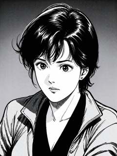Hoko,(best quality),((masterpiece)),(highres),extremely detailed,1980s retro manga style,1girl, solo, detailed line art, tight face close-up, short bob cut, intense focus expression, small stud earrings, hint of blazer lapel, dynamic shadows on face,