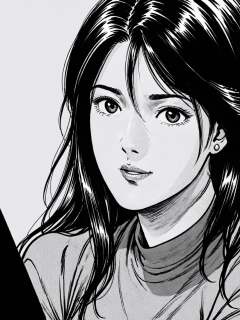 Hoko, (best quality), ((masterpiece)), (highres), extremely detailed, 1980s retro manga style, 1girl, solo, retro manga style, detailed line art, close-up portrait, long flowing hair framing face, sharp facial features, intense gaze directly at viewer, subtle smile, lipstick, pearl earrings, crisp white collar of executive blouse, high contrast shading,