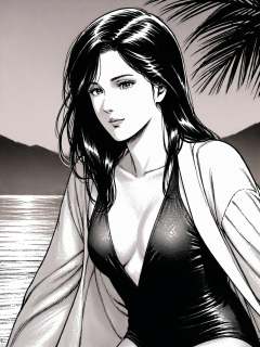 Close-up portrait of a young woman with long, wavy silver hair. Sharp facial features with an intense gaze and slight smile. Wearing a sleek black swimsuit with a plunging neckline, partially covered by a sheer white beach cover-up with flowing sleeves. Background is a blurred beach scenery, with soft shimmering lights from the setting sun and distant beach bonfires creating a warm, atmospheric setting. The golden sunlight casts a subtle, warm glow on the subject's face and hair, adding depth and dimension to the portrait.<lora:lora57:0.7>