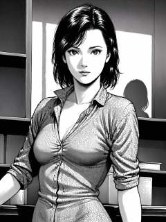 Hoko,(best quality),((masterpiece)),(highres),extremely detailed,realistic style,1girl,solo,upper body,looking at viewer,medium length curly brown hair,sharp facial features,retro manga style,detailed line art,Vintage floral print blouse with ruffled collar,thoughtful gaze,Soft focus bookshelf in background,<lora:lora57:0.7>