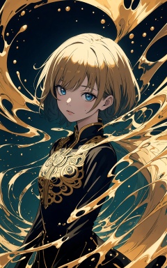 (in Otomo Katsuhiro style:1.2), high-quality, masterpiece, a woman’s face reflected in a pool of black ink, the ink swirling and distorting her features as it moves, delicate lines of gold ink tracing abstract patterns on the surface, Style is Minimalistic with surreal elements, Micro-detail ink textures, flowing liquid motion, soft reflection blur, dark ambient mood, (elaborately detailed attire with extraordinary elements:1.1), (hyperdetailed:1.1), (intricate details:1.0), (Refined details:1.1), (best quality:1.1), (high resolution:1.2)