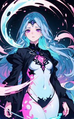 Close-up of an ethereal, pale-skinned young woman with long, straight, ice-blue hair and bangs covering her forehead. Her eyes are glowing magenta with dark, thin tears streaming down her cheeks, creating a ghostly, unsettling effect. She wears a high-neck, intricate, gothic-style black garment adorned with subtle chains, giving her a mysterious, dark allure. Background of swirling neon colors, shifting between magenta, electric blue, and deep violet, forming abstract spirals and waves that fade toward the edges. Subtle glowing symbols float among the colors, adding a hint of mysticism. Soft mist rises from the bottom, creating a dreamlike atmosphere.