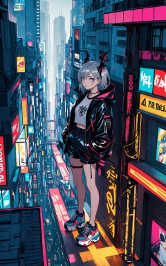 In anime, cyberpunk, ne0nfant4sy style, a hyper-detailed digital illustration features a woman exuding a futuristic edge, clad in urban clothing designed by Hedi Slimane. She wears high-waisted, loose-fitting cargo pants with glossy chrome components that shimmer in silver platinum, reflecting vibrant city lights. Her chunky platform sneakers echo this chrome aesthetic, merging functionality with style. Styled by Giorgio Armani, her look blends street fashion with high-end design. Bold graphic eyeliner and shimmering silver highlights, done by Charlotte Tilbury, enhance her striking features. With elongated black wings, she poses confidently atop a glowing neon-lit rooftop overlooking a sprawling metropolis. Captured by renowned photographer David LaChapelle, the scene encapsulates modern urban life infused with fantasy. The vibrant city skyline is illuminated by colorful digital billboards and flying vehicles. Shot with a Nikon Z9 from an elevated angle, it provides a panoramic view of the city while focusing on the model's powerful stance. Editing enhances the artwork, adjusting brightness for an ethereal glow, increasing contrast for light and shadow, and boosting saturation for vibrant neon colors. Highlights reflect off her chrome clothing and wings, creating a captivating illustration that embodies the cyberpunk aesthetic.