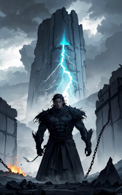 In a stormy wasteland where lightning forks across a sky of swirling black clouds, a towering figure with dark obsidian skin stands chained to a crumbling stone pillar. His eyes, glowing like molten lava, burn with an ancient, untamed power, even as his tattered cloak whips wildly in the wind. His muscular arms, bound by thick iron chains, strain against his restraints, while deep scars trace patterns across his skin, glowing faintly in the darkness. Surrounding him, the ground is cracked and scorched, with jagged rocks jutting up like the teeth of some long-dead beast. In the distance, colossal tornadoes twist and howl, throwing up clouds of ash and debris into the air, as lightning crackles ominously overhead. His long, black hair flows wildly in the tempest, and his breath comes in slow, heavy exhales, visible in the cold air. Behind him, a distant, shattered mountain looms like a broken sentinel, framed against the chaotic sky. The atmosphere is thick with the smell of sulfur and ozone, as the ground trembles with the distant rumble of thunder. This scene captures a moment of defiance against an unforgiving world, with raw power and elemental fury swirling all around.