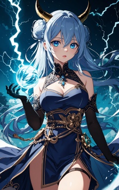 1girl, blue_eyes, double_bun, dress, elbow_gloves, electricity, gloves, hair_between_eyes, horns, lightning, long_hair, nail_polish, solo,