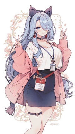 An anime girl,full body,wide_shot,1girl,shenhe (genshin impact),solo,animal ears,long hair,v,skirt,braid,looking at viewer,choker,smile,blue eyes,white background,breasts,double v,earrings,shirt,jewelry,long sleeves,simple background,blue hair,open clothes,alternate costume,bangs,jacket,closed mouth,contemporary,hairband,white shirt,pink jacket,id card,swept bangs,black choker,hands up,fake animal ears,lanyard,braided ponytail,black skirt,open jacket,blush,blue skirt,hair over one eye,black hairband,cowboy shot,hair ornament,single braid,very long hair,casual,large breasts,cat ears,