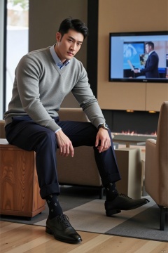 jzns, 1man,fashion model,asian,exquisite facial features,handsome,Business fashion,wearing sweater,shirt,pants,dark Pattern socks,Oxford style footwear,sitting,full body,indoors, natural  Lighting,magnificent,,masterpiece, realistic, best quality, highly detailed,