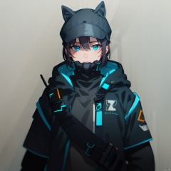 logo, military uniform, military, uniform, sneakers,arm wrap, long sleeves, backpack, police uniform, armor, official alternate costume, black pants, black jacket,black coat, pants, black gloves, arm wrap, gloves, fingerless gloves, jacket, hooded jacket,bandages, hat, bag