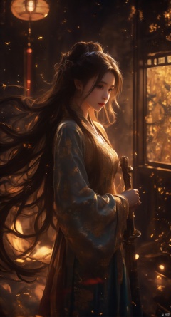 A Chinese noblewoman dressed in traditional hanfu attire, posing elegantly with a sword by her side. She stands confidently in a dimly lit room with intricate wooden paneling and silk tapestries, the soft glow of lanterns casting a warm ambiance. Her long black hair flows down her back like a waterfall, as she holds the sword with a sense of quiet determination.