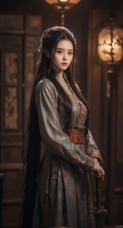 A Chinese noblewoman dressed in traditional hanfu attire, posing elegantly with a sword by her side. She stands confidently in a dimly lit room with intricate wooden paneling and silk tapestries, the soft glow of lanterns casting a warm ambiance. Her long black hair flows down her back like a waterfall, as she holds the sword with a sense of quiet determination.