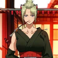 high heel boots,boots, print kimono, parted bangs, scar on forehead, wide sleeves, sleeveless kimono, scar on face, folded ponytail, kiseru, scar on cheek, red ribbon, hair ribbon, sleeveless, ponytail, detached sleeves, bare shoulders, thighhighs, fishnet legwear, sash, maple leaf, fishnets, long sleeves, purple eyes, jewelry, maple leaf pattern on kimono, hairclip, hair ornament, collarbone,scar,Tsukuyo,ninja,kunai,kimono,japanese_clothes,hair_stick,hair_ornament,arm_wrap,autumn_leaves,blonde_hair,black_kimono,1girl, blonde hair, japanese clothes, kimono, leaf, ninja, high heel boots
