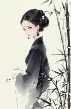 minimalism,Chinese ink painting,ink painting,1girl,solo,looking_back,from behind, upper body,black hair,long_hair,hair bun,earrings,jewelry, hair ornament,makeup,eyeshadow, black hanfu, long sleeves, closed mouth,flower, bamboo, leaf,simple background,master works, flat, high definition,white background <lora:20241018-1729215935508-000008:0.7> ,<lora:水墨时尚插画XL_水墨时尚插画:0.4>