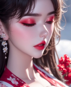 1girl, ,,Diamond Earrings , see-through, , floral_print, , solo, brown_hair, with heavy makeup,red lips,Moisturizing red lips,,eye makeup,close-up,cleavage,close the eyes  <lora:绝美头像1.3:1>