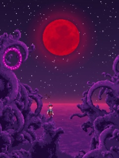 Pixel art,the swirling purple tentacles in a human universe,the scarlet full moon looms in the distance,