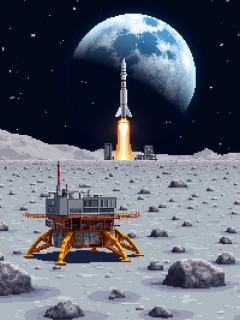 Pixel art,a human research station stationed on the surface of the moon,has a rocket liftoff in the distance with a huge afterimage of the earth in the background.,