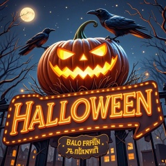 Captured at eye-level, a vibrant orange jack-o-lantern is adorned with glowing yellow eyes and a green stem. Above the pumpkin, two black crows are perched on a black wrought-iron fence, adding a pop of color to the scene. The sign, "HALLOWEEN" is adorned in a bright orange glow, with a yellow sign below it in a foreign language. The sky is a deep blue, dotted with white stars, and a full moon is visible in the upper left corner of the image.