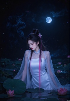 A Chinese beauty in a lotus pond, transparent white gauze off-shoulder dress, moon, full moon,night