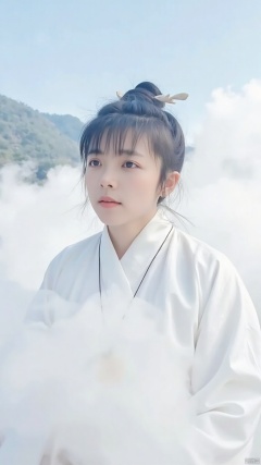 anquili,Chinese portrait photography, featuring ancient style beauties and unparalleled beauties. The lower part of the image is shrouded in white mist, creating a bright environment amidst clouds. Canon camera portrait shooting, 135mm, aperture 1.4, ultra realistic real person post production special effects, long shot,wide shot, A beautiful fairy, white dress, beautiful cheeks, high quality, masterpiece, masterpiece, ultra high definition, 8K