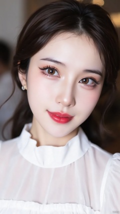 jiuyue,A close-up shot of a young Asian woman with dark brown eyes and dark brown hair. She is dressed in a white dress with a white blouse that has a ruffled collar. The background is blurred, but it is out of focus. The woman's lips are a vibrant shade of red. Her eyebrows are a darker shade of brown. She has a slight smile on her face, adding a pop of color to her face.