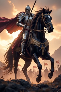 A majestic black horse stands tall, its mane flowing in the wind. A knight in shining armor, holding a lance, sits proudly on its back. The scene is set in a medieval battlefield, with the sun setting in the background, casting a golden glow. The knight's cape flutters dramatically, and the horse's muscles are tense, ready for action. The composition is dynamic, with the horse and rider in the center, framed by the rugged landscape.