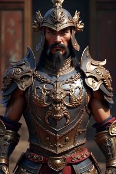 A detailed close-up shot of a handsome, muscular male warrior wearing intricately designed ancient Chinese armor without a helmet. The armor features ornate dragon motifs and polished metal plates, highlighting his strong physique. Soft, warm light illuminates the scene, casting dramatic shadows that emphasize the detailed engravings and the warrior's imposing presence. The composition captures the warrior in a dynamic, confident pose, exuding strength and protection. The background is blurred, focusing attention on the warrior's powerful form and the grandeur of the armor.