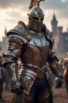 A full-body shot of a handsome, muscular male warrior wearing a sleek, medieval-style plate armor without a helmet. The armor is composed of polished metal plates, highlighting his strong physique. Soft, natural light bathes the scene, casting subtle shadows that emphasize the warrior's rugged features and powerful stance. The composition captures the warrior in a dynamic, confident pose, standing tall and exuding strength. The background is a medieval battlefield, with distant castles and a dramatic sky, emphasizing the warrior's role in the epic struggle.