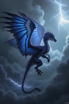 A majestic Western dragon with feathered wings, soaring through a stormy sky. The dragon's scales shimmer with iridescent colors, blending seamlessly with its bird-like feathers. The scene is framed mid-air, with lightning illuminating the dragon's powerful form. The composition highlights the dragon's graceful yet fierce pose, as it glides effortlessly through the turbulent clouds. The background features dark, swirling clouds and distant lightning strikes, emphasizing the dragon's mythical presence.