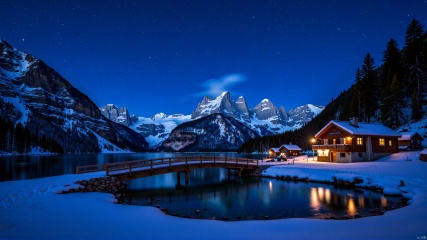 The image is a beautiful landscape of a snowy mountain village at night. The sky is filled with stars and the mountains are covered in snow. The village is located on the shore of a lake, with a wooden bridge crossing over it. On the right side of the image, there is a wooden cabin with a sloping roof and a chimney. The cabin is lit up with warm lights, creating a cozy and peaceful atmosphere. The lake is calm and reflects the lights from the cabin and the surrounding mountains. The mountains in the background are tall and majestic, with snow-capped peaks. The overall mood of the scene is peaceful and serene.