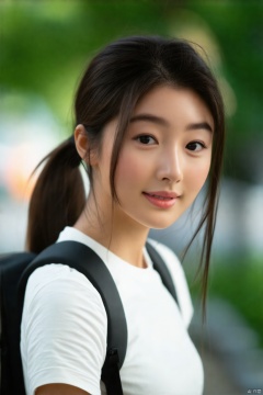 a young Asian woman with long dark brown hair, wearing a white t-shirt and a black backpack. The woman's eyes are a piercing black, and her lips are a pinkish-pink. Her hair is pulled back in a ponytail, adding a pop of color to her face