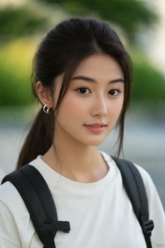 (a young Asian woman, long dark brown hair, white t-shirt, black backpack, piercing black eyes, pinkish-pink lips, hair in a ponytail, (best quality,4k,8k,highres,masterpiece:1.2), ultra-detailed, (realistic,photorealistic,photo-realistic:1.37), HDR, UHD, studio lighting, ultra-fine painting, sharp focus, physically-based rendering, extreme detail description, professional, vivid colors, bokeh, detailed face, beautiful detailed eyes, beautiful detailed lips, extremely detailed eyes and face, long eyelashes, natural makeup, casual style, outdoor setting, soft sunlight, warm tones, modern urban background, clean and simple, minimalist, contemporary art, portraiture)