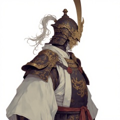 kabuki, armor, solo, weapon, helmet, sword, male focus, simple background, 1boy, white background, upper body, from side, profile, shoulder armor, japanese clothes, gauntlets, japanese armor, samurai, katana, closed mouth, holding, ponytail