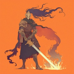 knight, armor, weapon, helmet, sword, gauntlets, solo, full armor, cape, shoulder armor, holding weapon, breastplate, hand on hilt, holding, pauldrons, holding sword, torn clothes, faulds, long hair, 1other, standing, chain, floating hair, 1boy, simple background, orange background, torn cape, planted, fire