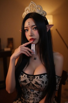 A captivating portrait of a Qing dynasty-inspired Jiangshi maiden. Framed in a warm, golden light, the subject sits proudly, her long black hair flowing down her back like a dark waterfall. Her piercing gaze meets the viewer's, adorned with subtle makeup and a striking red lip color. A delicate hat rests atop her raven tresses, featuring intricate designs that echo the ornate patterns on her Chinese attire. Notably, she sports pointy ears and a forehead mark, hinting at her supernatural nature. The overall composition is centered around her captivating blue eyes, which seem to hold a mystical allure. The ofuda, a sacred paper talisman, rests discreetly near her lips, adding an air of mystique to the scene.