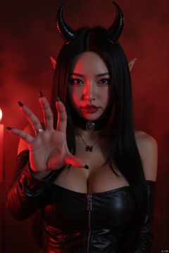 (woman dressed as devil),reaching out hand,towards camera,horns and wings on headpiece,wearing black and red,beautiful detailed eyes,beautiful detailed lips,extremely detailed eyes and face,long eyelashes,(best quality,4k,8k,highres,masterpiece:1.2),ultra-detailed,(realistic,photorealistic,photo-realistic:1.37),HDR,UHD,studio lighting,ultra-fine painting,sharp focus,physically-based rendering,extreme detail description,professional,vivid colors,bokeh,gothic style,dark atmosphere,red and black tones,dramatic lighting,smoky background,evil expression,clawed fingers,leather outfit,metal accessories,fiery aura,shadowy environment,glowing eyes,ominous presence,haunting beauty,oneuandgr