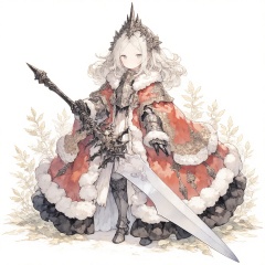 princess, 1girl, armor, solo, weapon, sword, long hair, crown, gauntlets, standing, dress, full body, looking at viewer, holding, fur trim, holding weapon, holding sword, parted bangs, breastplate, armored boots, armored dress, grey eyes, closed mouth, white hair, boots, greaves, planted, tiara, planted sword