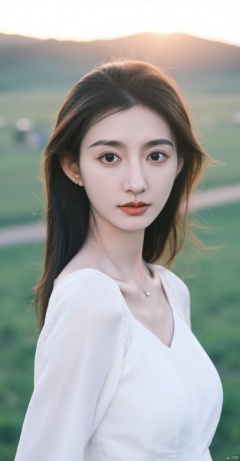 (woman in white,looking sideways,sunset,on grassland),beautiful detailed eyes,beautiful detailed lips,extremely detailed eyes and face,long eyelashes,white flowing dress,soft expression,side profile,standing gracefully,windblown hair,golden hour lighting,warm tones,peaceful atmosphere,rolling hills in background,soft shadows,evening sky,glowing horizon,serene landscape,natural beauty,realistic skin texture,gentle breeze,calm and tranquil,(best quality,4k,8k,highres,masterpiece:1.2),ultra-detailed,(realistic,photorealistic,photo-realistic:1.37),HDR,UHD,studio lighting,ultra-fine painting,sharp focus,physically-based rendering,extreme detail description,professional,vivid colors,bokeh,landscape photography