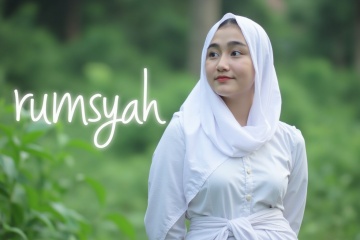 a photorealistic upperbody of rumsyah, a young asian woman dressed in a white muslim robe. Her head is adorned with an white hijab. the background is blurred outdoor grass cinematic with word behind her "rumsyah" in white semi transparant lettering. focus to woman,