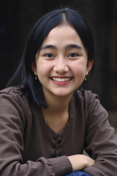 A close-up photo of rumsyah, A young asian woman. She is looking at the viewer with bright and loving eyes, grin with her teeth. She is leaning forwardal. Close-up of face, very detailed. She is wearing a perfect soft sweater. Hasselblad H6D-400c MS, low exposure, high contrast, ISO 100, with a 120mm macro lens.,