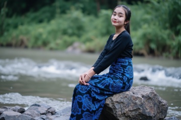 a photorealistic upperbody of rumsyah, a young asian woman is seated on a rock, her gaze directed towards the viewer. She is dressed in baduy outfit, a black top, and a blue skirt adorned with a pattern of flowers. she is wearing a silver bracelet on her left wrist. Her left hand is resting on a gray rock, while her right hand rests on her right knee. The background is blurred with a stream of water and greenery cinematic. focus to woman,