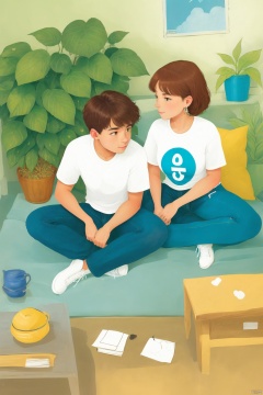 A cartoon drawing of a boy and girl sitting on a white couch. The boy is wearing a white t-shirt with blue letters on it. He has short brown hair and a white smile on his face. The girl has long brown hair, a yellow shirt and blue jeans. She is holding a black game controller in her hands. She has long white earrings in her ears. Her hair is pulled back in a ponytail. Her jeans are blue and her shoes are white with white laces. Behind her is a plant with green leaves.,