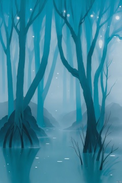 A misty river scene, its banks lined with ancient trees rendered . The mist-shrouded river reflects the pale moon, creating an eerie, almost supernatural beauty. A single figure, a faint silhouette of a boatman, is barely visible on the river.