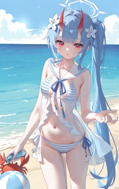 masterpiece,best quality,high quality,(colorful),[Artist miwano rag],[Artist toosaka asagi],[Artist wlop],[Artist chen bin],Artist omone hokoma agm, ((loli)),1girl, solo, long hair, breasts, looking at viewer, hair ornament, red eyes, navel, holding, blue hair, swimsuit, flower, bikini, small breasts, outdoors, horns, sky, day, striped, hair flower, sailor collar, side ponytail, see-through, ocean, halo, beach, bottle, ball, oni horns, striped bikini, white sailor collar, crab, ramune,chiseBA