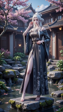 1 girl, solo, a girl standing on a stone in the yard. Vibrant colors. Gradient perspective, gradient posture, white hair, hair accessories, necklace around the neck. Jewelry, earrings, black strapless dress, long skirt. The clothes are embroidered with white patterns. Silk material clothing, long sleeves, waistband. Pale face, snow-white skin, pink eyes, a red mark on the forehead, red lips, eye shadow. Beauty makeup. Bare legs, bare feet, slender legs, perfect body proportions, slim. Touch your face with your left hand and place your waist with your right hand.
