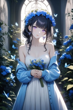 1girl, solo. She has long black hair with bangs and a hair ornament. Her purple eyes are captivating. She wears a white sleeveless dress with spaghetti straps and an open blue jacket. The dress is off shoulder, revealing her bare shoulders and collarbone. She wears jewelry including earrings and a head wreath with blue flowers. A flower adorns her hair. She holds her own hands together, looking at the viewer with a closed mouth and a slight head tilt. In the background, there are bugs, plants, and a butterfly. The scene is illuminated by backlighting. She has puffy sleeves on the jacket and long sleeves on the dress.